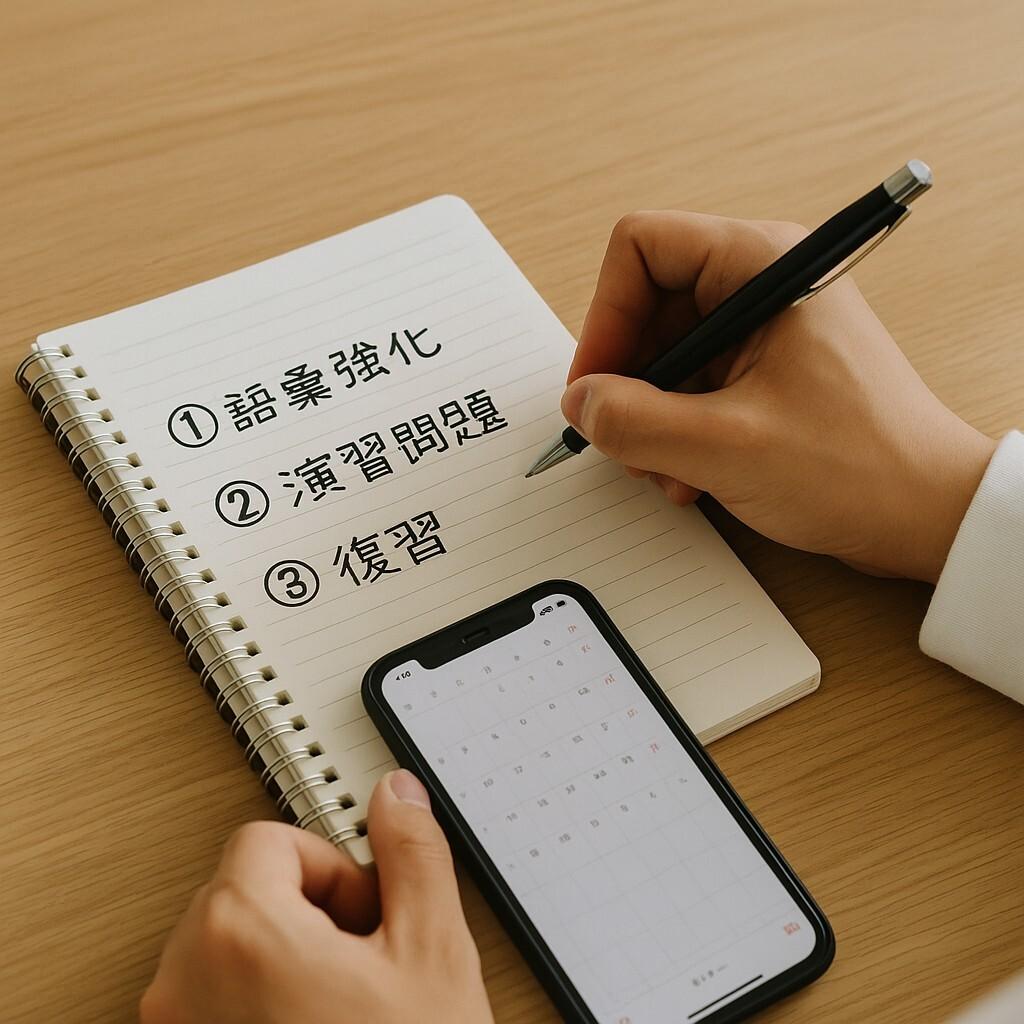 短期間で成果を出すためには、毎日継続したい3つのタスクがあります。「①語彙強化」「②演習問題」「③復習」のサイクルです。語彙は少量でも継続し、問題は形式に慣れることを目的に行います。復習ではミスの原因を分析し、翌日の学習に反映します。この3つを継続することで、学習効果が自然と積み上がります。